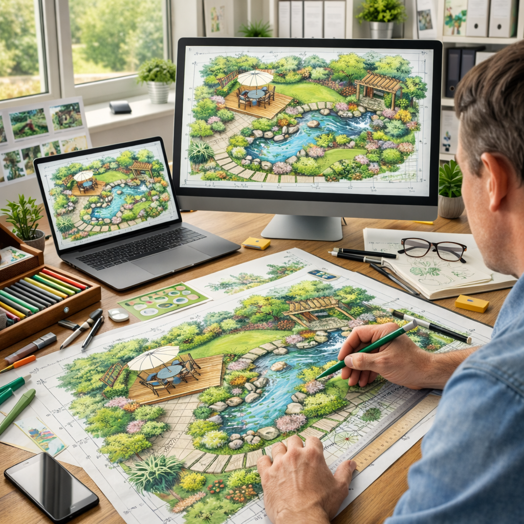 - Projekt koncepcyjny: Na podstawie tych informacji powstaną pierwsze szkice i trójwymiarowe wizualizacje komputerowe. Dzięki nim zobaczysz efekt końcowy jeszcze przed rozpoczęciem jakichkolwiek prac ziemnych i będziesz mógł wprowadzić ewentualne poprawki.